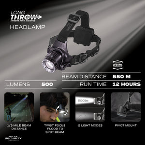 Elevate your hands-free lighting experience with Police Security’s Long Throw Headlamp, featuring Extreme Beam Technology.™ Delivering an impressive beam reach of up to a third of a mile and 500 lumens of brightness, this headlamp is ideal for fields, parks, and wide-open spaces. Its intuitive twist-focus and pivot head design let you effortlessly adjust the beam for precision lighting exactly where you need it. Powered by an eco-friendly LiPo 144045 rechargeable battery, it combines convenience with environmental responsibility. Illuminate your path with confidence and sustainability.