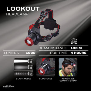 Look out basic headlamps. The Police Security Lookout Headlamp will blind you with versatility. With an impressive 1000-lumen output, the Lookout Headlamp is one of the brightest out there. It also features Slide Focus optics, 3 lighting modes, and a pivoting head for added flexibility. Designed for mechanics and hands-free activities, it's also designed for comfort and ease of use. The adjustable headband is comfortable for long-time wear.
