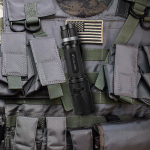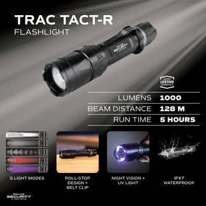Police Security’s Trac Tact R is the ultimate, multi-use rechargeable tactical flashlight. Precision-crafted from architectural-grade aluminum, this powerhouse operates on 5 modes, including a night vision-friendly red light and a 395 nM UV light. The included 18650 Rechargeable Battery ensures lasting power, providing 1000 lumens for up to 5 hours across different modes. With its IPX7 waterproof rating, the Trac Tact R is built to withstand the elements and is backed by Police Security's Lifetime Warranty for ultimate peace of mind.