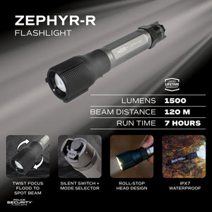 The Zephyr-R Rechargeable Flashlight from Police Security Flashlights is the ultimate tactical flashlight, combining power, precision, and rugged durability for professionals, outdoor enthusiasts, and emergency preparedness.