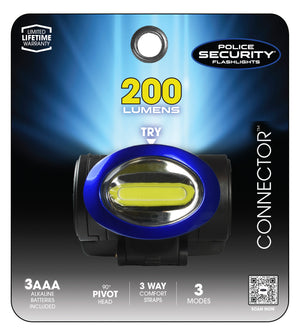 If it weren't designed for comfort, just the thought of this much innovation could make your head hurt. From the latest, greatest Chip On Board (COB) technology and 200 lumens of broad beam light to its High, Medium, and Flash modes, the compact Police Security Connector was born on the leading edge. Add a pivoting head and comfort adjust straps, and the Connector is a great hands-free value for both mechanics and DIYers. Includes 3 AAA Police Security Alkaline Batteries.
