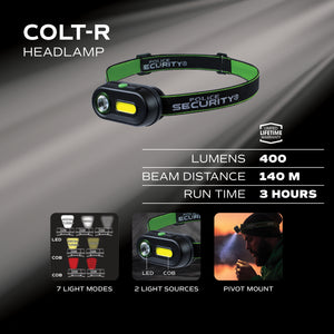 The 400 lumen headlamp built for adventure, work, and emergency situations. The Colt-R Rechargeable Headlamp by Police Security Flashlights delivers powerful, hands-free LED illumination, a 140-meter beam distance, and a rechargeable battery, making it the perfect tool for campers, mechanics, and outdoor enthusiasts who need bright, long-lasting light.