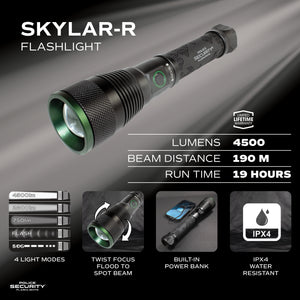 Pure Lighting POWER. The Skylar-R from Police Security is a 4500 lumen ultra-bright LED flashlight that will light up the sky! Equipped with a convenient USB charging system (cable included), the Skylar-R features 2x26650 rechargeable lithium-ion battery, providing up to 19 hours of runtime. With multiple modes and twist focus, this flashlight easily adapts to a wide range of situations.