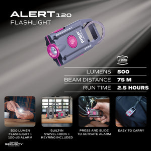 Stay safe and be seen with the Patent Pending ALERT120 – a powerful 120-decibel personal alarm combined with a 500-lumen rechargeable flashlight. Designed for convenience and security, this easy access, multi-functional device features an ear-piercing 120dB alarm with blinding strobe light for added visibility to deter threats and attract attention. A quick release hook and key ring allows for easy attachment to a purse, backpack or keychain for instant access. Perfect for students, joggers, or anyone on the go, the ALERT120 is a compact, yet powerful safety essential.