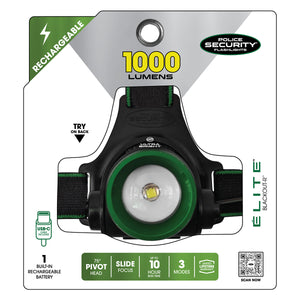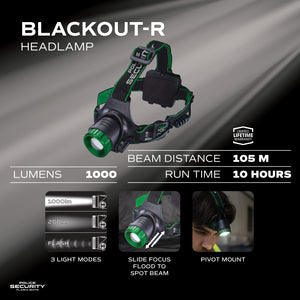 Kiss total darkness goodbye. The 1000 lumen Police Security Blackout-R Headlamp is one of the brightest on the market. Not to mention one of the most versatile headlamps available. Along with its high-quality LED chip, the Blackout-R Headlamp features Slide Focus optics, 3 light modes, and a pivoting head for added flexibility. Comfort comes from its adjustable straps and you help the environment by going rechargeable. A 3000mAH lithium-polymer rechargeable battery and a USB charging cable are included.