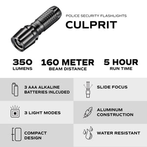 Designed for personal safety and everyday convenience, the Culprit Flashlight fits easily in your pocket, purse, or glove compartment. Its durable, lightweight construction makes it the perfect go-to flashlight for work, emergencies, and night-time visibility.