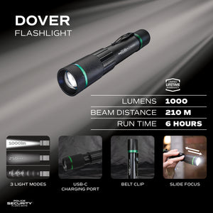 Count on it today. Rely on it tomorrow. The Police Security Dover Rechargeable Flashlight is optimal for automotive technicians and mechanics - any professional demanding long-term flashlight performance. With our Quik Connect USB charging system (cable included), this 1000-lumen flashlight functions with a 18650 rechargeable lithium-ion battery delivering up to 6 hours runtime. With High, Low, Flash modes and Slide Focus, the Dover Rechargeable Flashlight is immediately adaptable to a variety of situations and will be for a long time to come.
