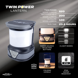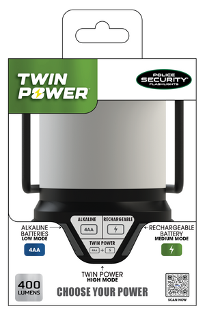 The dual power lantern that ensures long-lasting, adaptable illumination wherever you go. The Twin Power® 520 Lumen LED Lantern from Police Security Flashlights features patent-pending Dual Power technology, allowing you to switch between rechargeable and alkaline battery sources at the press of a button. With three lighting modes, a heavy-duty hanging handle, and an ultra-long 23.5-hour runtime, this rugged, high-performance lantern is perfect for camping, emergencies, and outdoor adventures.