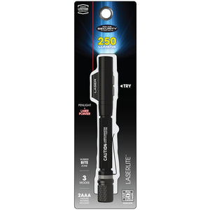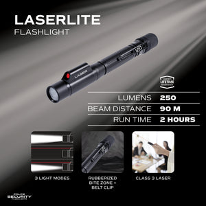 Introducing the Police Security LaserLite flashlight – your ultimate companion for precision and power. This sleek penlight doubles as a laser pointer, delivering 250 lumens of brightness whenever you need it. Crafted for convenience, the LaserLite features dual switches conveniently placed on the head of the flashlight, granting you effortless control. Its rubberized bite zone offers a secure grip, ensuring comfort and stability even in the most demanding situations. With Police Security's Limited Lifetime Warranty, you can trust in the durability and reliability of the LaserLite for years to come. Illuminate your path with confidence – choose the LaserLIte for unmatched performance and peace of mind.