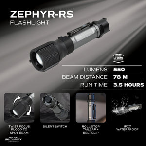 The 550 lumen flashlight that delivers ultra-bright, tactical performance in a compact, rechargeable design. The Zephyr-RS Rechargeable Flashlight from Police Security Flashlights is built for professionals, first responders, and outdoor enthusiasts, offering high-performance illumination, a 78-meter beam distance, and a 3.5-hour runtime. Engineered for tactical precision, it features a silent switch, twist focus, and durable construction, making it the perfect tool for mission-critical situations and everyday carry.